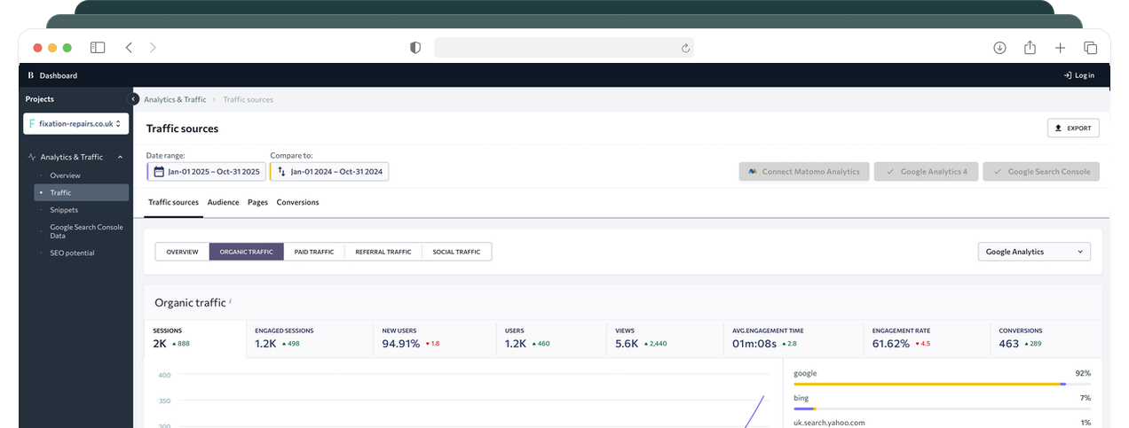 Our SEO dashboard includes keyword rankings tracking, competitor research tools, AI and LLM keyword discovery features, website audits, backlink analysis, content audits, Google Analytics integration, Search Console connectivity, detailed performance insights and many more.